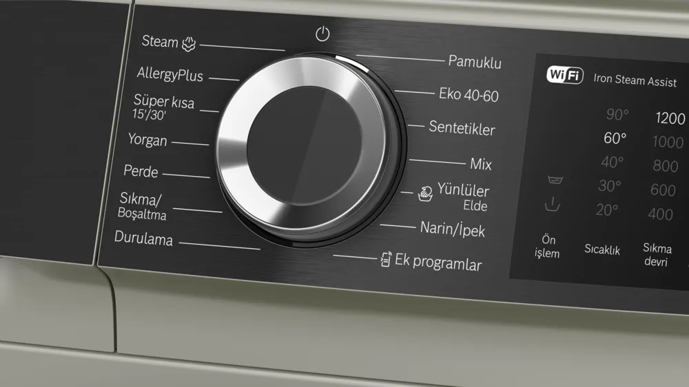 AllergyPlus, Steam, Perde, Sıkma-Boşaltma, Mix, Durulama, Yorgan, Süper-Kısa 15'/30', Kırışıklık önleme, Kalan süre erteleme, Başlat/Beklet tuşu, Sıcaklık seçimi, Speed Perfect, Devir sayısı seçimi