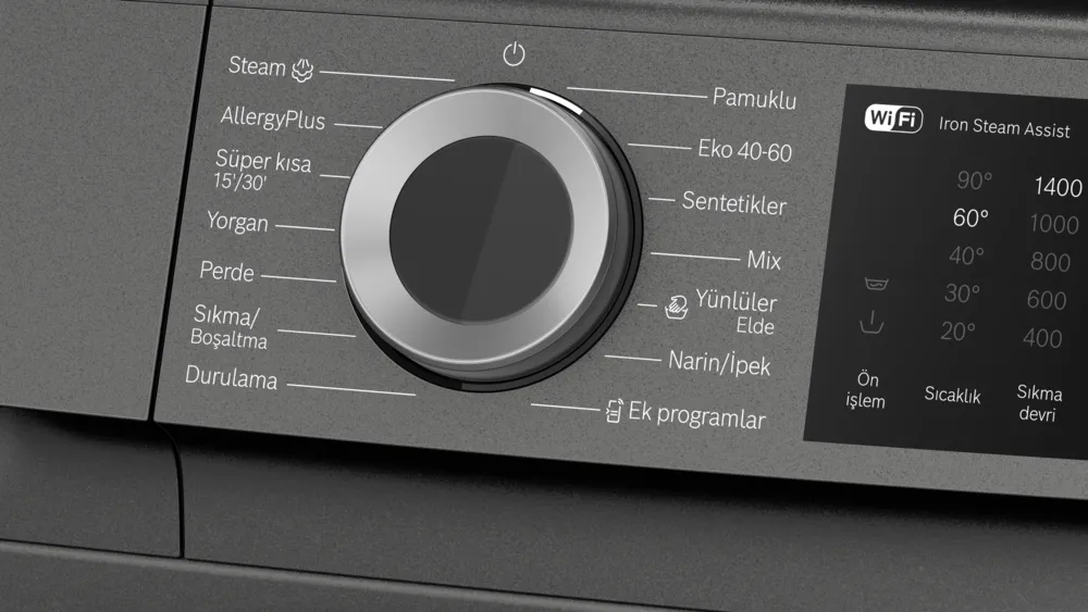AllergyPlus, Steam, Perde, Sıkma-Boşaltma, Mix, Durulama, Yorgan, Süper-Kısa 15'/30', Kırışıklık önleme, Kalan süre erteleme, Başlat/Beklet tuşu, Sıcaklık seçimi, Speed Perfect, Devir sayısı seçimi
